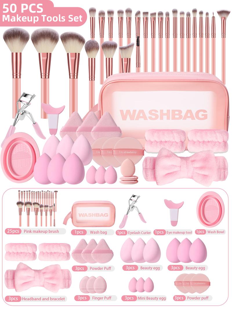50PCS Makeup Tools Set Including:1PCS Multi-Functional Zipper Toiletry And Cosmetic Bag Waterproof+25PCS Makeup Brush Set+6PCS Makeup Sponges+3PCS Mini Makeup Sponges+3PCS Triangle Powder Puffs+3PCS Mini Air Cushion Powder Puffs+1PCS Hairband+2PCS Hand Bowl Strap+1PCS Makeup Brush Cleaning Tools+3PCS Air Cushion Powder Puff+1PCS Eye Makeup Aid+1PCS Eyelash Curler
